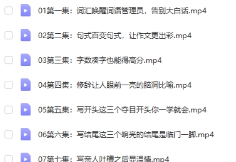 | 花生酥小作家成长营:超好用的作文提升妙招课程 课程目录: ├──01第一集:词汇唤醒词语管理员,告别大白话.mp4 233.41M ├──02第二集:句式百变句式,让作文更出彩.mp4 145.76M ├──03第三集:字数凑字也能得高分.mp4 151.41M ├──04第四集:修辞让人眼前一亮的脑洞比喻.mp4 130.66M ├──05第五集:写开头这三个夺目开头你一学就会.mp4 172.56M ├──06第六集:写结尾这三个响亮的结尾是临门一脚.mp4 166.40M ├──07第七集:写亲人吐槽之后显温情.mp4 136.25M ├──08第八集:写老师抓住本质来选材.mp4 140.03M ├──09第九集:写陌生人教你写出两种陌生人.mp4 191.98M ├──10第十集:感人的事制造感动的三个魔法.mp4 154.02M ├──11第十一集:快乐的事引爆童趣的三个秘密.mp4 163.83M ├──12第十二集:游记作文告别流水账的时候到了.mp4 172.65M ├──13第十三集:读后感三个妙招让你“感悟”多多.mp4 143.18M ├──14第十四集:想象作文想象千万别“脱轨”!.mp4 171.37M └──15第十五集:演讲稿小学生也能驾驭大主题.mp4 145.92M |
